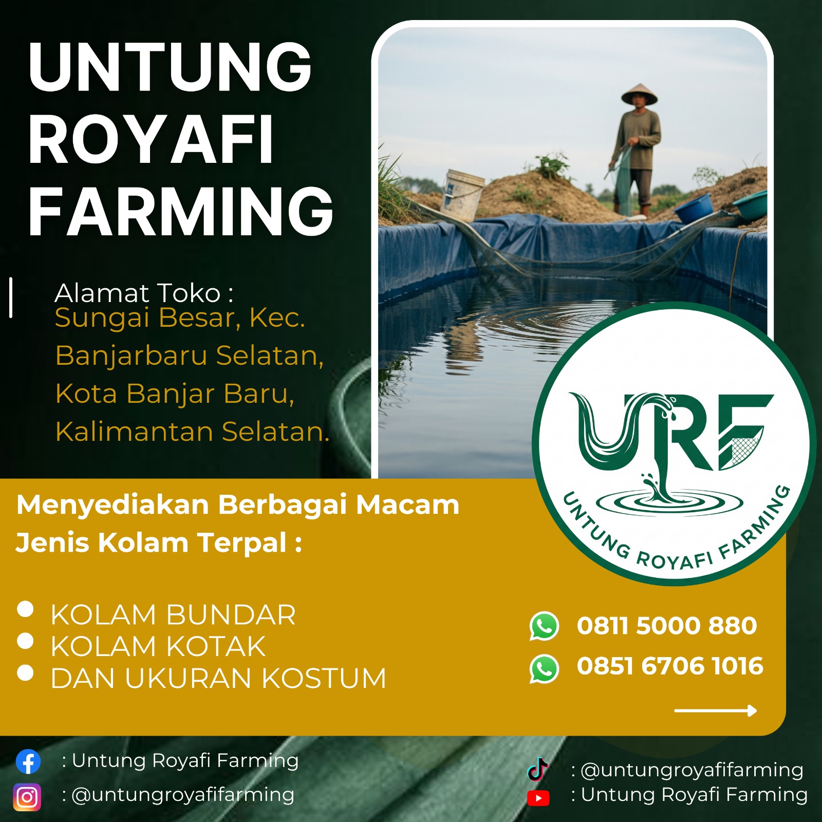 ROYAFI FARMING merupakan produsen sekaligus agen penjualan kolam terpal berkualitas berbahan Terpaulin Orchid. Kantor kami beralamatkan di Jl. Setia Komplek Perumahan Fadillah Perdana 1 dan 2 No. 10 A Kabupaten Banjar KALSEL.